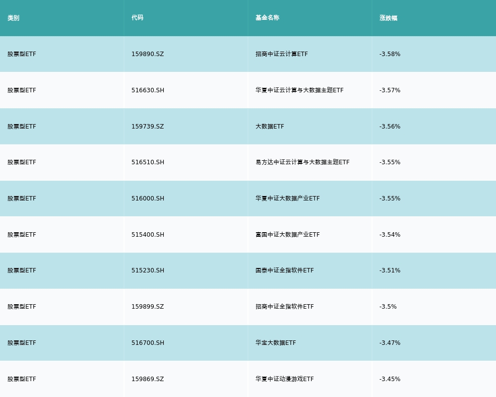 昨日股票型ETF跌幅最大的3支ETF及其收益率分别为:招商中证云计算ETF(-3.58%)、华夏中证云计算与大数据主题ETF(-3.57%)、大数据ETF(-3.56%)。跌幅前10详情见下表: