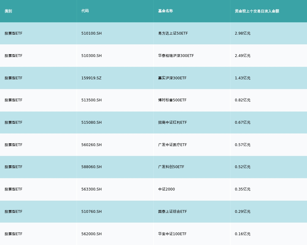 昨日股票型ETF资金流入最多的3支ETF及其流入金额分别为:易方达上证50ETF(流入2.98亿元)、华泰柏瑞沪深300ETF(流入2.49亿元)、嘉实沪深300ETF(流入1.43亿元)。资金流入前10详情见下表: