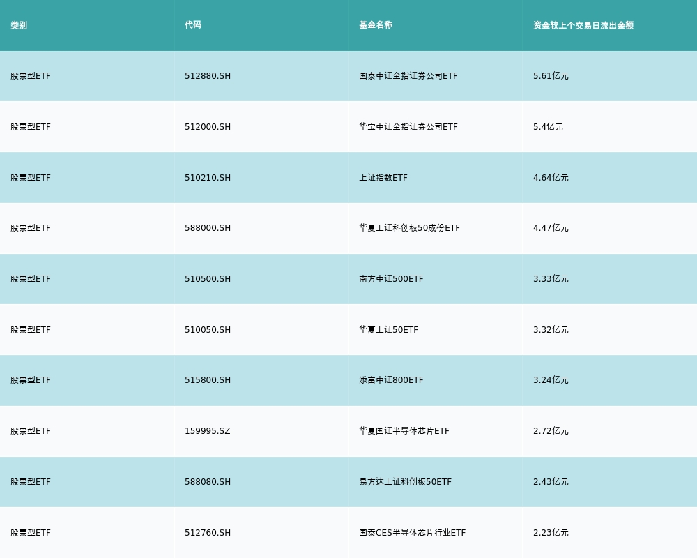 昨日股票型ETF资金流出最多的3支ETF及其流入金额分别为:国泰中证全指证券公司ETF(流出5.61亿元)、华宝中证全指证券公司ETF(流出5.4亿元)、上证指数ETF(流出4.64亿元)。资金流出前10详情见下表: