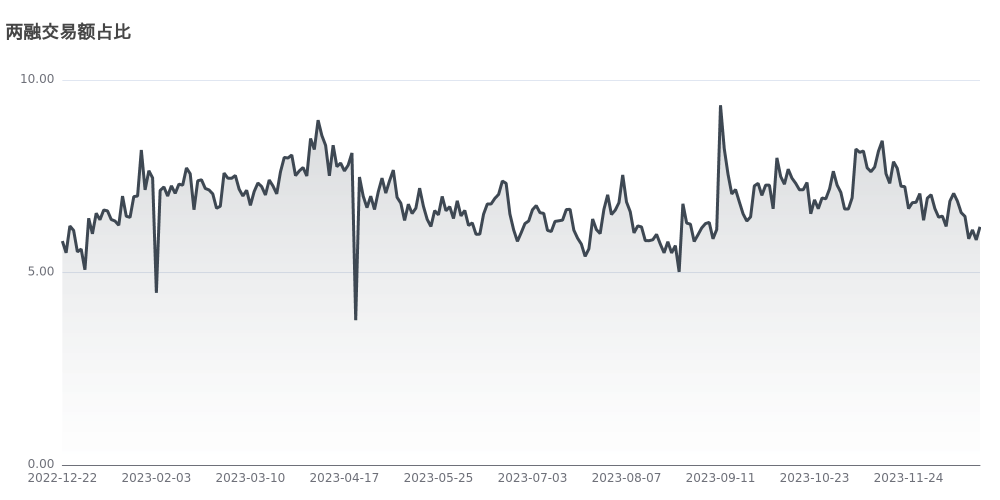 今日该指标值为6.19%,目前该指标处于近一年较低区间,说明投资者认为A股市场趋于触底反弹。反映场内投资者借钱炒股的杠杆水平,该指标越高说明杠杆水平越高,即投资者认为当前市场较强,反之则说明投资者认为市场相对较弱,因而与上证指数存在较强的正相关性。