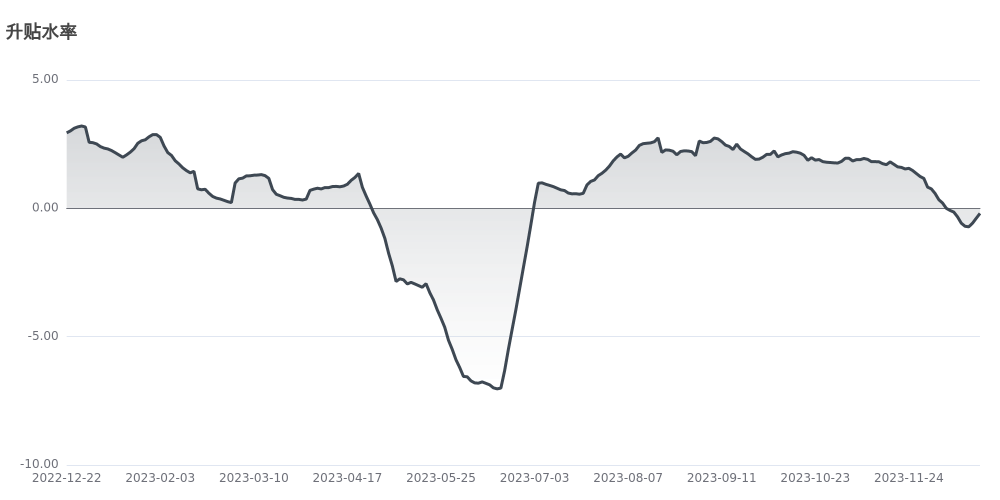 今日该指标值为-0.20%,目前该指标处于近一年较低区间,说明投资者对认为A股市场趋于触底反弹。反映期货市场投资者对市场的看法,该指标越高说明投资者认为当前市场较强,越低则说明认为市场相对较弱,因而与上证指数正相关。