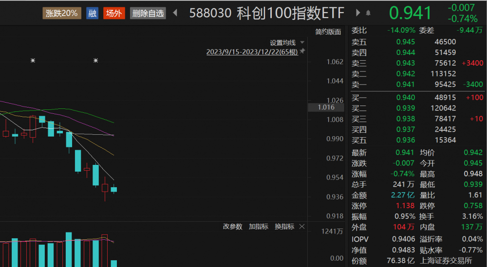 科创100指数ETF(588030)跟随指数走势,盘中常现溢价交易,成交额突破2.27亿元。