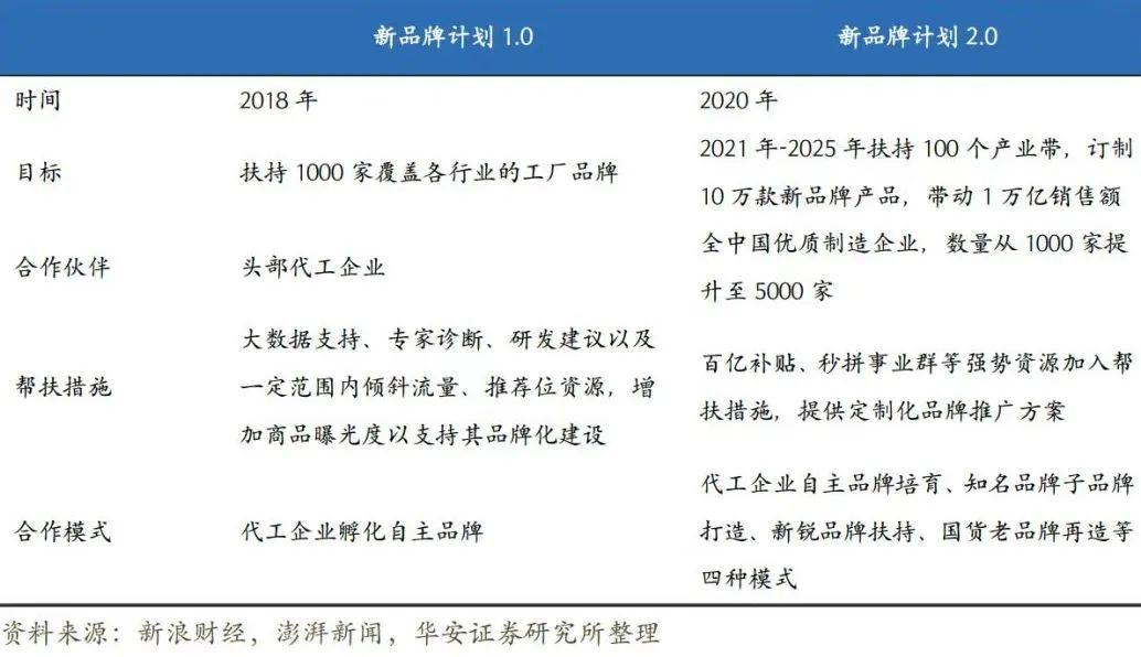拼多多更早地捕捉到了这个趋势。早在2018年,拼多多就开启了新品牌计划,重点扶持代工厂,并逐渐扩大产业带,到2020年时,该计划进行升级,要在未来5年内,扶持100个产业带,带动1万亿销售额。此外,合作伙伴要从1000家扩展至5000家。除了以前的头部代工企业,更多优秀制造工厂会纳入其中。