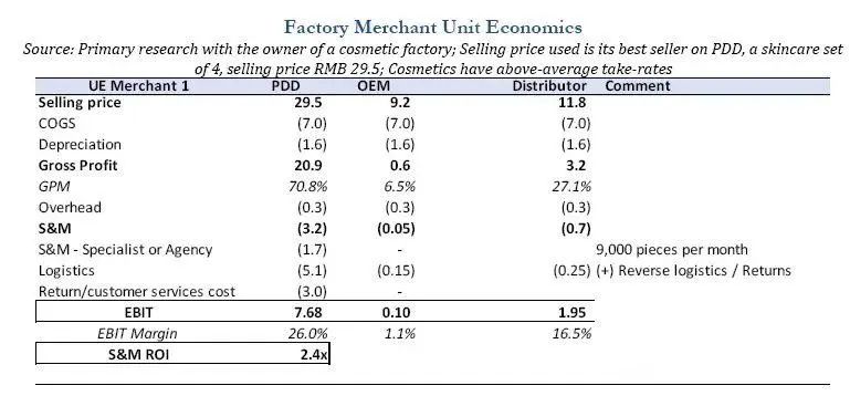 当然,对于厂商而言,获利是最根本的驱动力。数据显示,很多加入拼多多平台的源头生产商,利润率都实现了倍数增长。比如假睫毛工厂“睫诗雅睫毛工坊”曾是一家代工厂,利润率很低,进入多多跨境电商后,净利率达到了惊人的40%。“北海茶客”援引的一份研报显示,一家美妆工厂在拼多多的毛利率可以达到20%,而做代工时只有6.5%。
