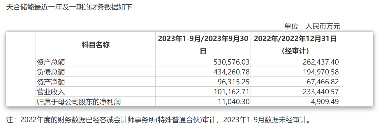 公告显示,天合储能去年全年营收达23.34亿元,归属于母公司股东净亏损0.49亿元,而今年前九个月的业绩表现却似乎不敌上年。今年前九个月,天合储能的资产总额为53.06亿元,负债总额由19.50亿元增至43.43亿元。今年前九个月的营收为10.12亿元,不及去年一半,但归属于母公司的净亏损为1.10亿元,胜于去年亏损规模的一倍。