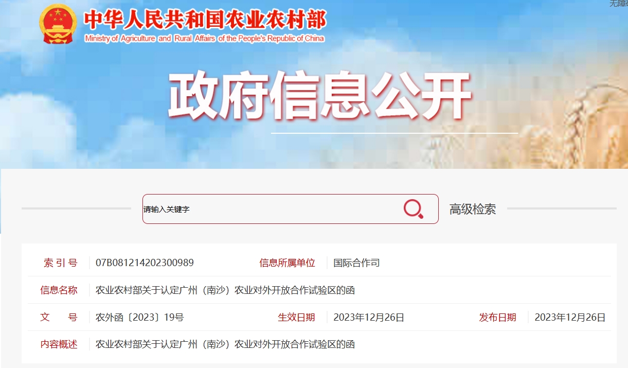 12月26日,农业农村部官网发布了《农业农村部关于认定广州(南沙)农业对外开放合作试验区的函》(以下简称“函件”)。函件指出,考虑到广州市南沙区创建农业对外开放合作试验区(以下简称“南沙试验区”)基础优势明显、目标定位清晰、建设内容具体、组织保障有力,符合《农业对外开放合作试验区管理办法(试行)》(农外发〔2021〕5号)相关要求,现对南沙试验区予以认定。这是自2017年7月农业农村部认定首批10家农业对外开放合作试验区之后,新增的首个通过农业农村部认定的试验区。