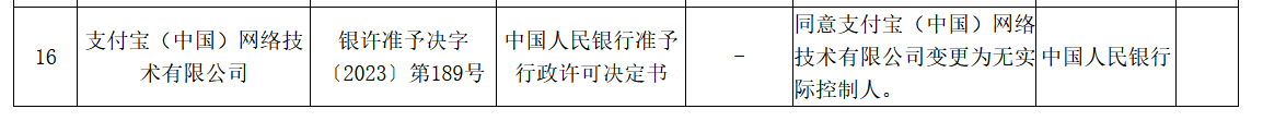 中国人民银行官网的非银行支付机构重大事项变更许可信息公示(截至2023年12月)显示,央行发布银许准予决字 [2023] 第189号文,同意支付宝 (中国) 网络技术有限公司变更为无实际控制人。
