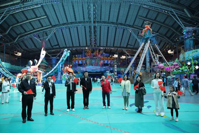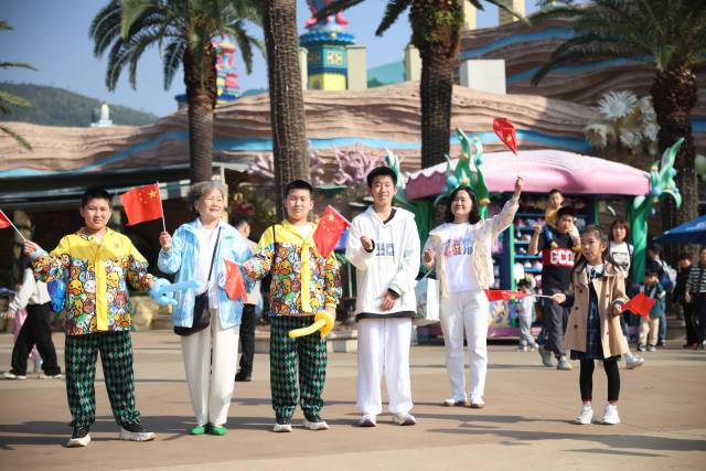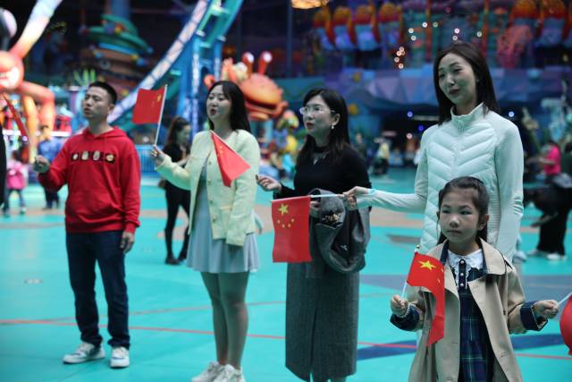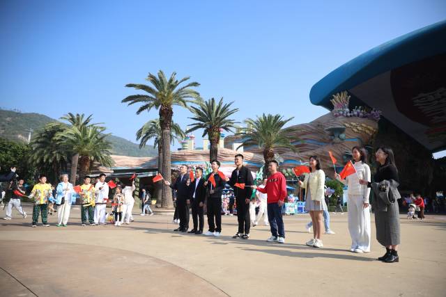 1月1日上午10时,珠海长隆海洋王国天幕广场响起了耳熟能详的乐曲,吸引了过往的游客驻足观看。大人小孩纷纷停下脚步,拿出手机拍摄,感受着这份游乐园中的“小幸福”。大家随着音乐的节奏挥舞着小红旗,用歌声表达对祖国母亲的祝福,将氛围推向高潮。