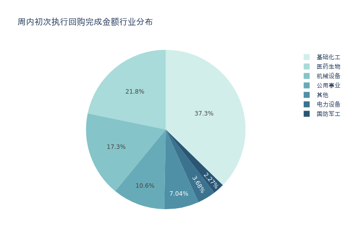 按照初次执行金额所在不同行业分布,金额最高的3个行业分别为:基础化工、医药生物、机械设备,详情见下图: