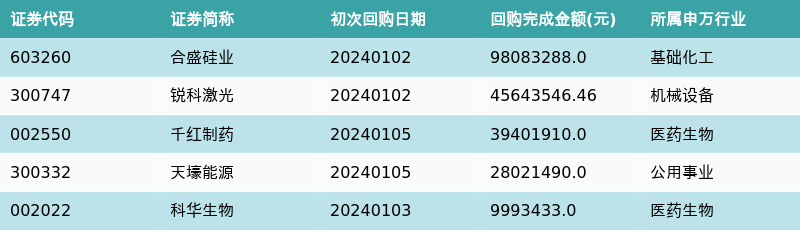 1月2日-1月5日,共有18条开始执行回购公告,其中执行金额最多的5条公告为: