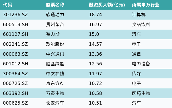 1月2日-1月5日,两市共有3320只个股有融资资金买入,共有11只个股买入金额超10亿元,其中软通动力、贵州茅台、赛力斯排名前三,买入金额分别18.74亿元、16.97亿元、15.0亿元。融资买入额前10个股详情见下表: