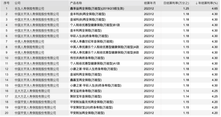 Wind数据显示,截至2023年12月,纳入统计的275款产品中,仍有55款年结算利率在4.0%以上,涉及中国太保、中英人寿、北大方正人寿、中国平安、长生人寿、富德生命人寿、新华人寿、中意人寿、财信吉祥人寿、工银安盛人寿等多家公司。其中,长生人寿所售“鑫享益两全保险(万能型)”年结算利率达4.65%,中国太保、中英人寿所售多款产品结算利率均在4.3%以上。