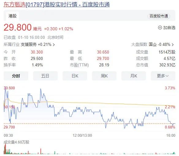 与此同时,东方甄选的股价也呈现上升趋势,1月10日收盘,东方甄选上涨1.02%,收29.800港元/股,最新市值278亿人民币。
