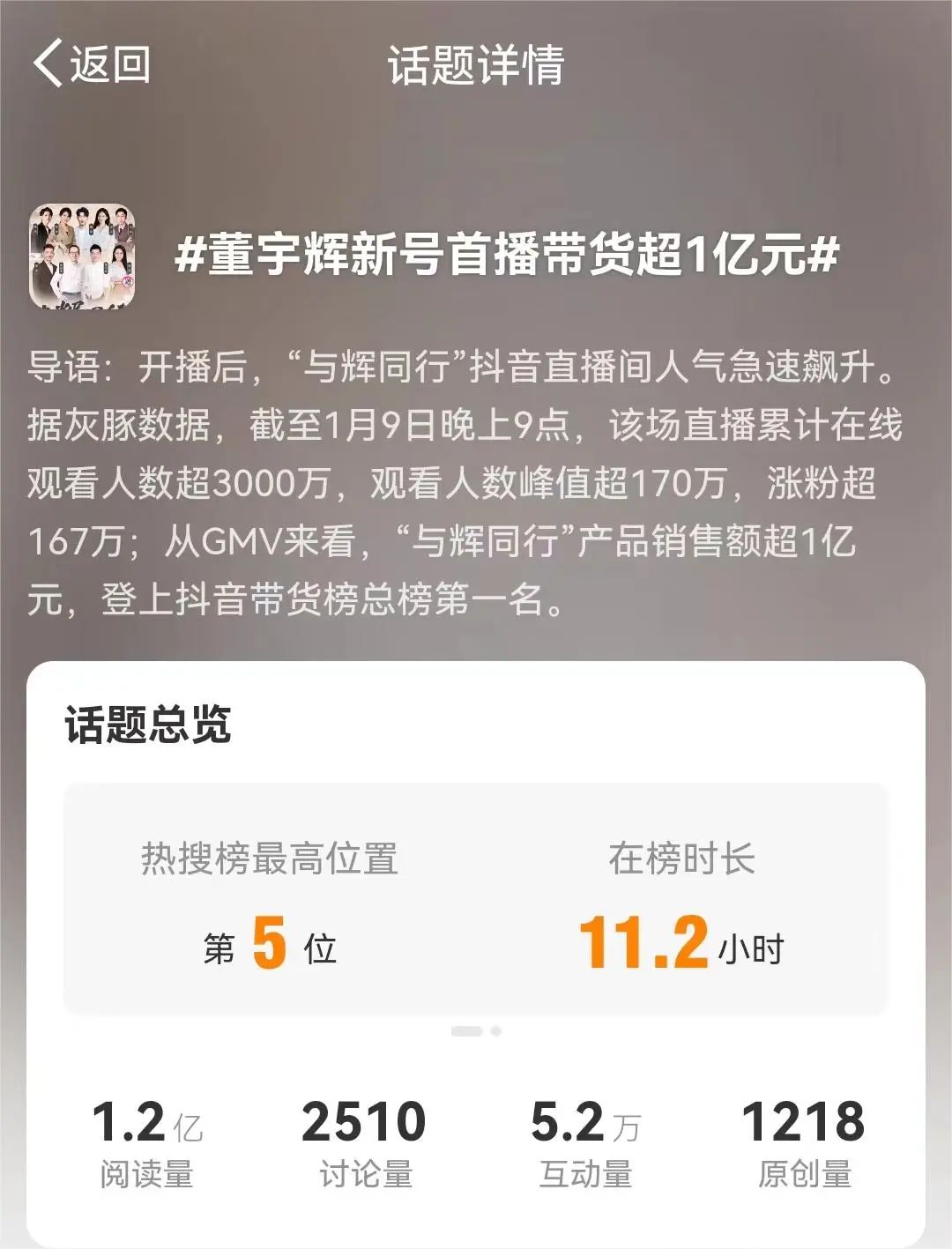 “董宇辉新号首播带货超1亿元” 图源:微博