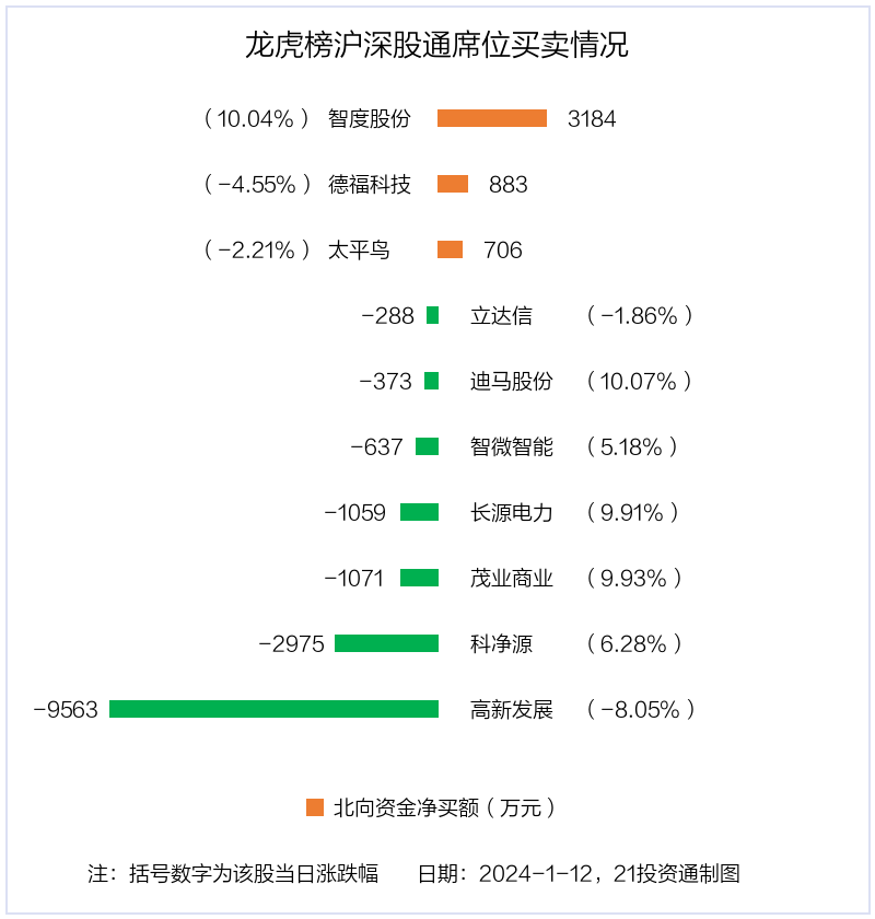 1月12日,北向资金参与龙虎榜中的个股共有10只,合计净卖出1.12亿元。其中沪股通净买入1 股,净卖出3 股,合计净卖出1024.94万元;深股通净买入2 股,净卖出4 股,合计净卖出1.02亿元。