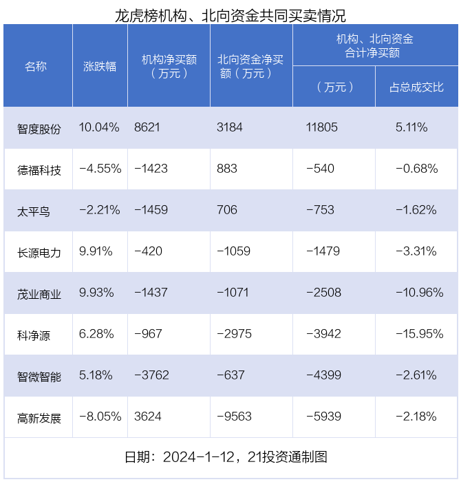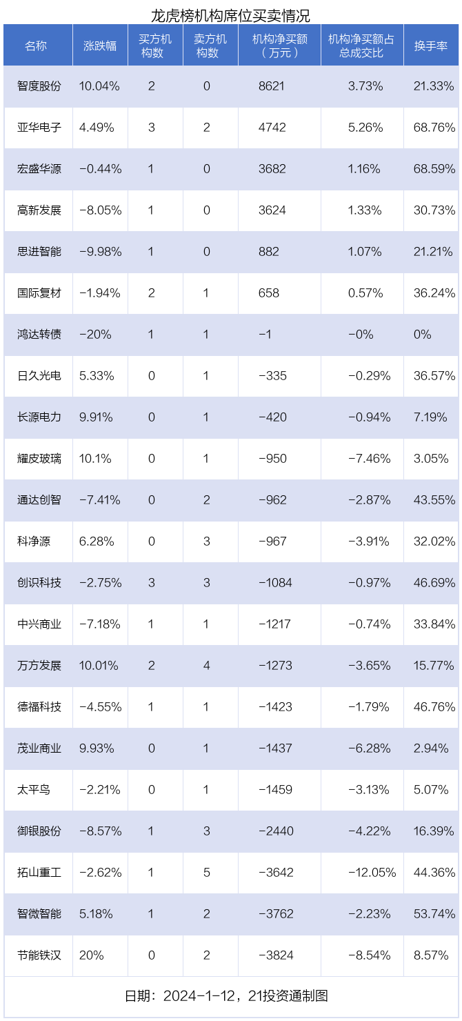 1月12日,上证指数下跌0.16%,深证成指下跌0.64%,创业板指下跌0.91%。盘后龙虎榜数据显示,共有37只个股因当日异动登上龙虎榜,资金净流入最多的是智度股份(000676.SZ),达0.85亿元。