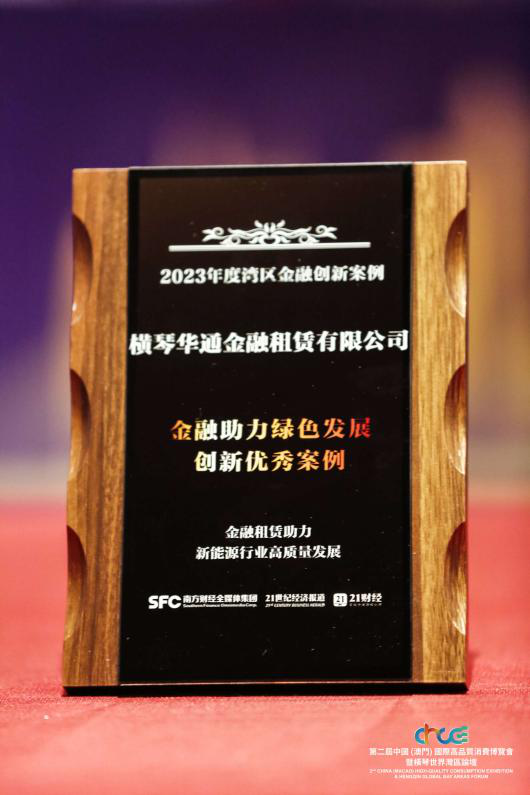 2023年12月,由横琴粤澳深度合作区金融发展局、南方财经全媒体集团指导,21世纪经济报道、中国自贸区信息港主办的第二届中国(澳门)国际高品质消费博览会暨横琴世界湾区论坛金融主题论坛在珠海横琴举办。横琴华通金融租赁有限公司(以下简称“华通金租”)“金融租赁助力新能源行业高质量发展”项目荣获2023年度湾区金融社会责任类-金融助力绿色发展创新优秀案例。
