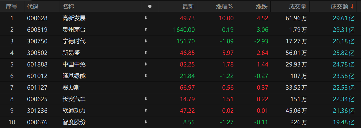 个股方面,高新发展成交额29.61亿元居首,贵州茅台、宁德时代、新易盛、中国中免、隆基绿能、赛力斯、长安汽车、软通动力等成交额在20亿元之上。