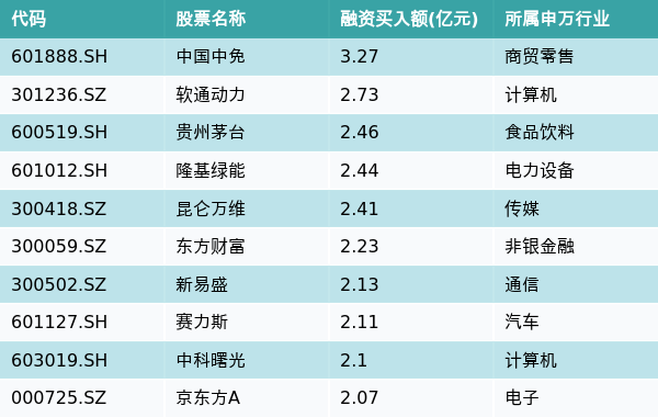 1月15日,两市共有3325只个股有融资资金买入,其中中国中免、软通动力、贵州茅台排名前三,买入金额分别3.27亿元、2.73亿元、2.46亿元。融资买入额前10个股详情见下表: