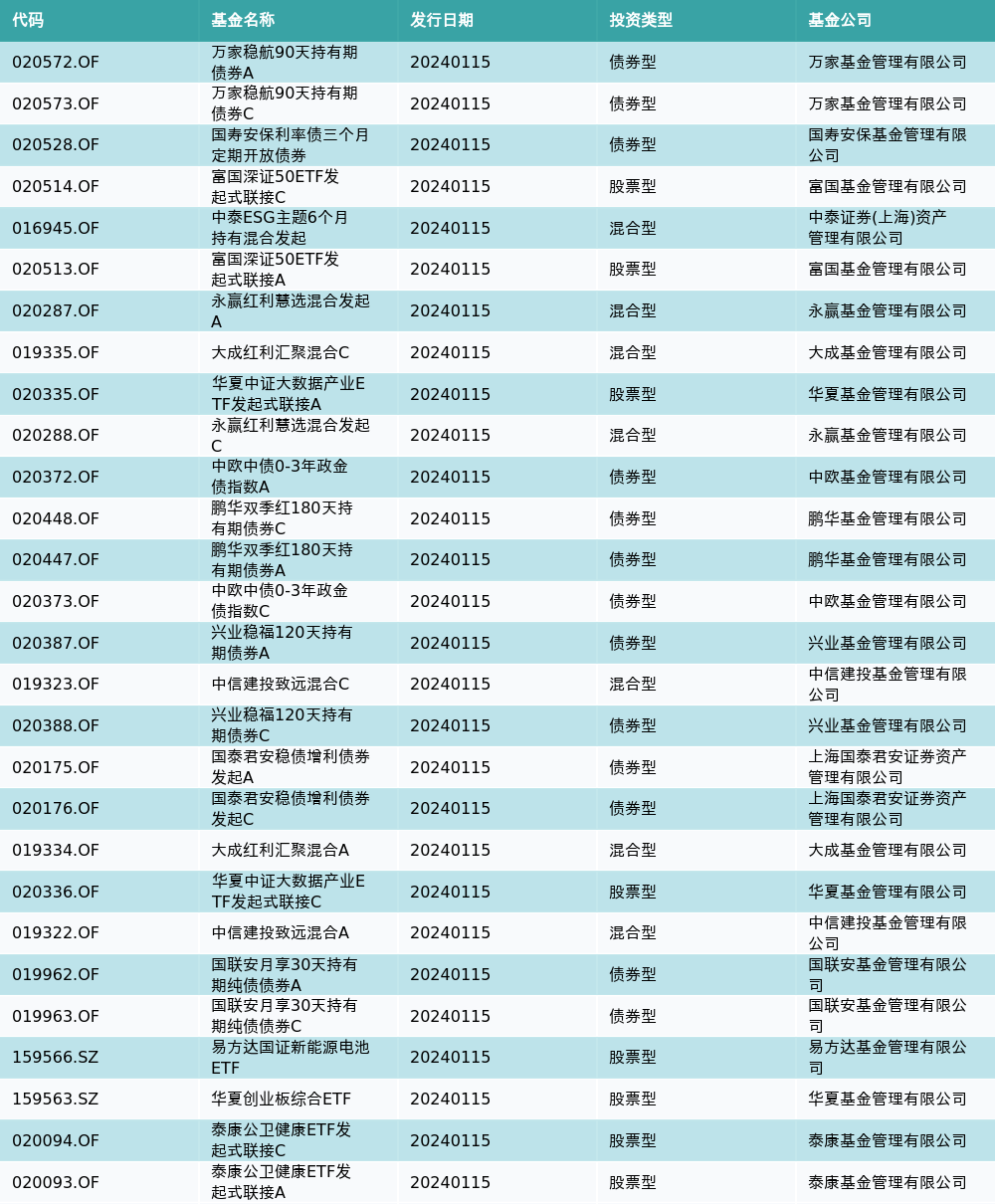 1月15日有28只新基金发行,分别为:万家稳航90天持有期债券A、万家稳航90天持有期债券C、国寿安保利率债三个月定期开放债券、富国深证50ETF发起式联接C、中泰ESG主题6个月持有混合发起、富国深证50ETF发起式联接A、永赢红利慧选混合发起A、大成红利汇聚混合C、华夏中证大数据产业ETF发起式联接A、永赢红利慧选混合发起C、中欧中债0-3年政金债指数A、鹏华双季红180天持有期债券C、鹏华双季红180天持有期债券A、中欧中债0-3年政金债指数C、兴业稳福120天持有期债券A、中信建投致远混合C、兴业稳福120天持有期债券C、国泰君安稳债增利债券发起A、国泰君安稳债增利债券发起C、大成红利汇聚混合A、华夏中证大数据产业ETF发起式联接C、中信建投致远混合A、国联安月享30天持有期纯债债券A、国联安月享30天持有期纯债债券C、易方达国证新能源电池ETF、华夏创业板综合ETF、泰康公卫健康ETF发起式联接C、泰康公卫健康ETF发起式联接A,详情见下表: