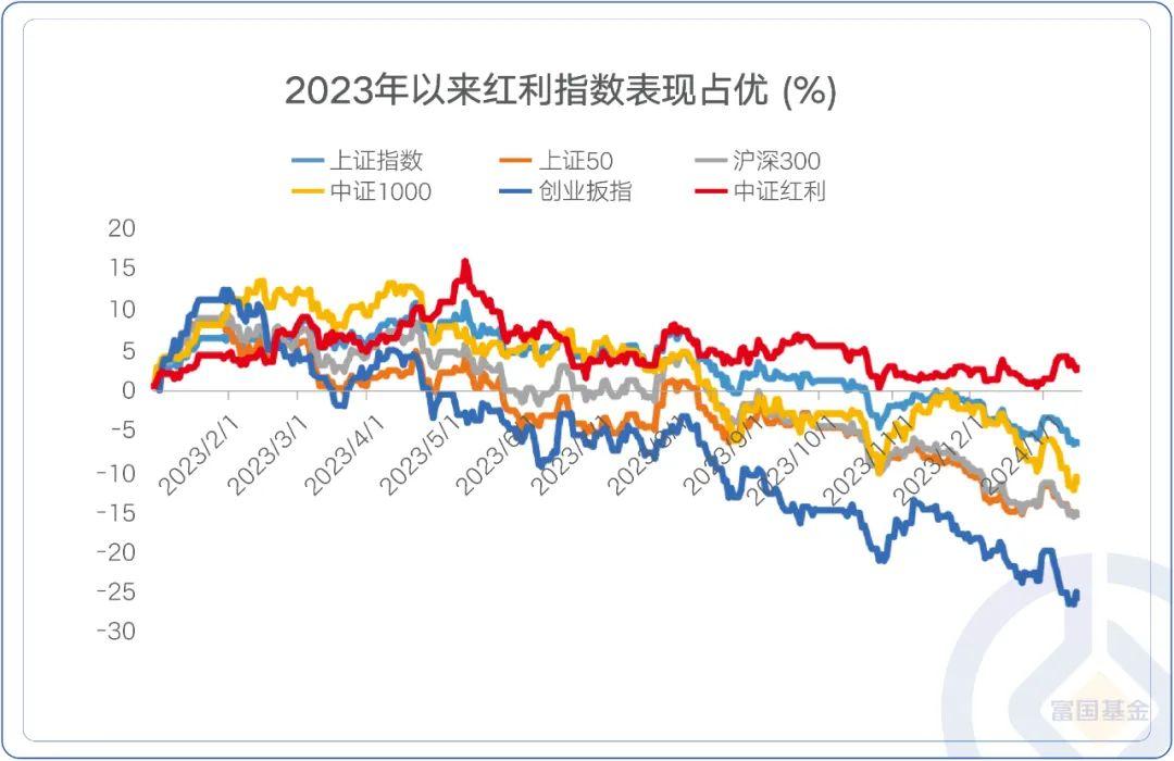 实际上,开年以来高股息红利资产的表现也许是2023年行情的一种延续,2023年,在偏股基金指数全年下跌14.61%的情况下,中证红利指数逆势上涨0.89%(数据来源:Wind),早在去年末,富二便在《震荡市中的一枝独秀,红利来年还能继续上车吗?》为客官科普过红利资产在震荡市中良好的防御能力。
