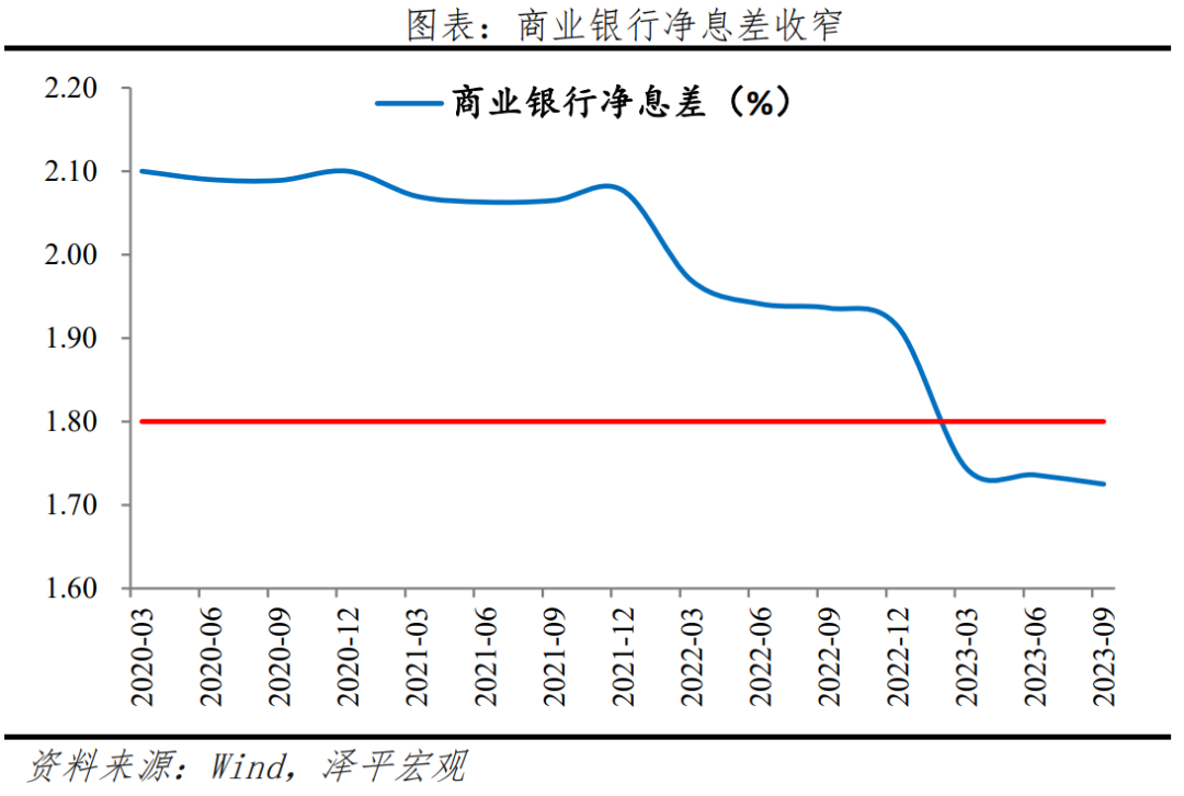 二是银行净息差收窄,防范化解风险仍需要一定安全垫。商业银行维持稳健经营、防范金融风险,需保持合理利润和净息差水平。当前我国商业银行净息差持续收窄,2023年9月降至1.73%,连续三个季度低于1.8%的警戒线。尽管近期银行启动新一轮存款降息潮,但传导存在时滞,每轮存款降息潮均由国有行带头启动,“大行先行,中小行跟进”,到中小银行全部落地预计至少有3个月时间。此轮存款利率尚在调整中,部分中小银行出于竞争压力,短期存款利率逆势上涨。若银行负债端成本跟不上资产端变化速度,不利于维持稳健经营。