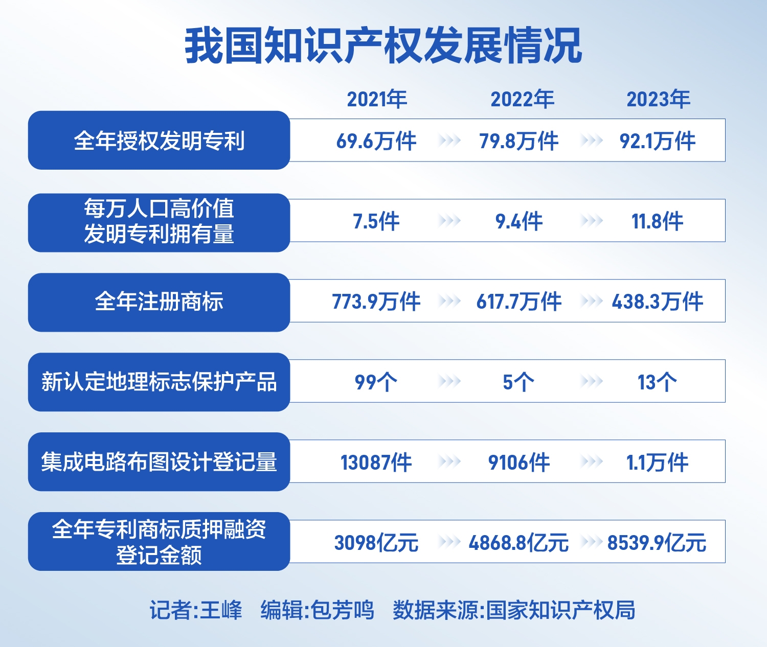 2023年,知识产权运用大踏步前行。全年专利商标质押融资登记金额8539.9亿元,惠及企业3.7万家。