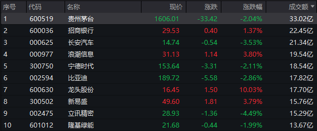 沪深两市半日成交额3546亿,较上个交易日同期缩量585亿。个股方面,贵州茅台半日成交额33.02亿元居首,招商银行、长安汽车成交额均超20亿元,分别为22.45亿元、21.34亿元,浪潮信息、宁德时代、比亚迪、龙头股份、新易盛、立讯精密成交额均超15亿元。