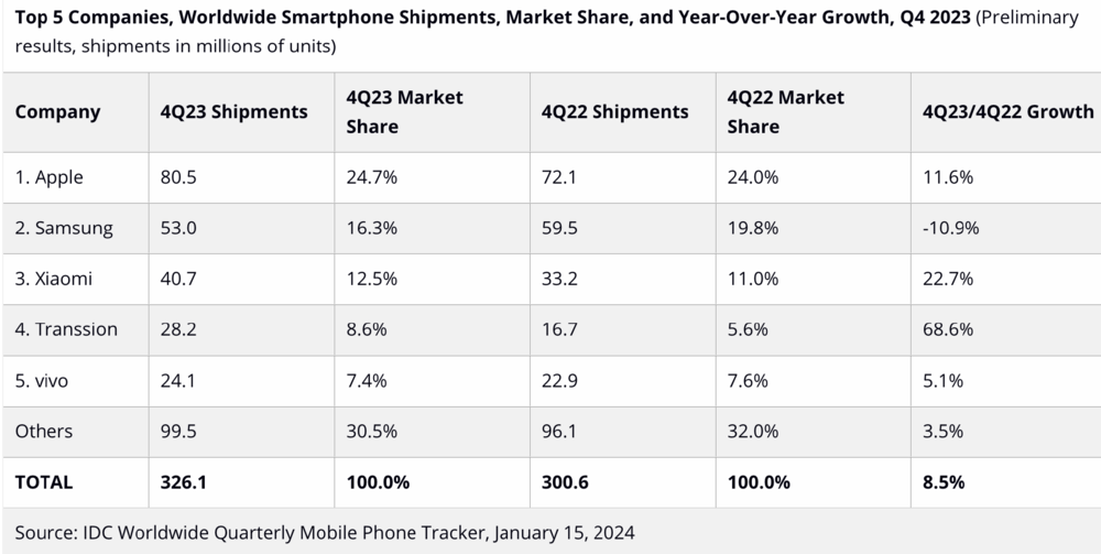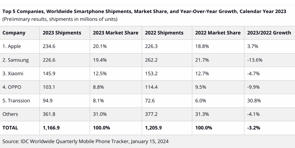 2023年,苹果首次超过三星登顶年度手机销冠