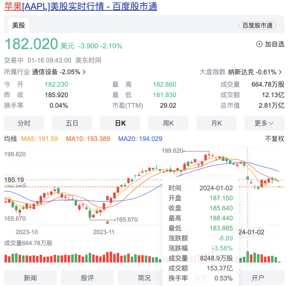 上一次苹果登上热搜,还是因为2024年首个交易日的股价大跌,1月2日,苹果股价跌幅达到3.58%,市值一夜之间蒸发掉了1071亿美元(约合人民币7660亿元),创下2023年8月4日以来最大跌幅,以及2023年11月9日以来收盘新低。