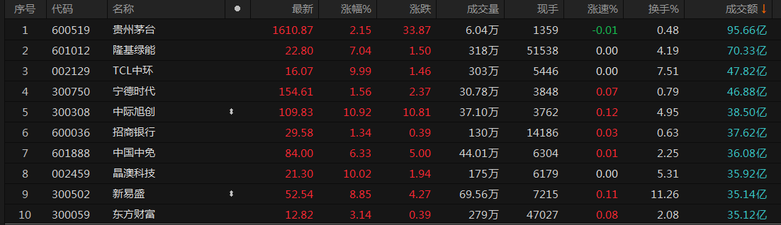 个股方面,贵州茅台成交额95.66亿元居首,隆基绿能、TCL中环、宁德时代成交额居前。