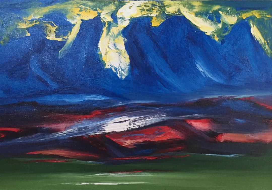 意幻风景画创作中一直保持注意力的密度与纯度,这需要爆发力和内在张力,这是生命气质的表达。 因为笔触需要一次过,不能重复,在作画过程中始终让心灵处于独立个体的气场里。
