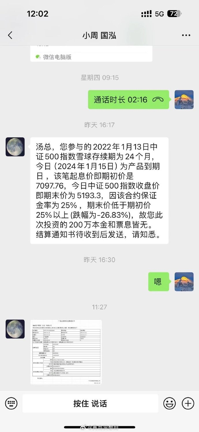 同样是一张聊天截图,根据截图,一家百亿私募参与的4倍杠杆雪球产品到期,面临着200万本金全无的结果,截图中的“汤总”只是回复一个“嗯”字,淡定程度非常人能及。据中证报报道,“汤总”疑似属于铸锋资产管理(北京)有限公司,为该期权产品的交易对手方。