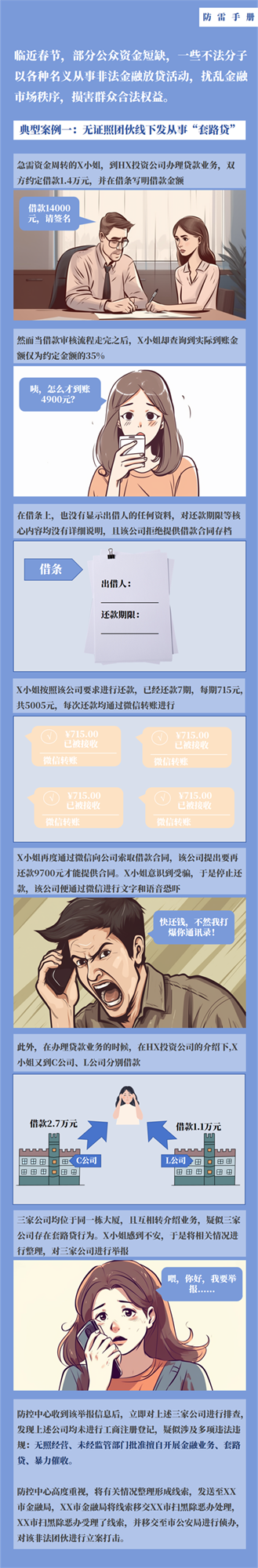 临近春节,部分公众资金短缺,一些不法分子以各种名义从事非法金融放贷活动,扰乱金融市场秩序,损害群众合法权益。
