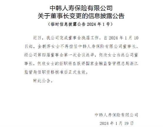 近日,中韩人寿发布公告称,公司完成董事会换届工作,自2024年1月10日起,金朝萍不再担任中韩人寿董事长,何欣当选公司董事长,其任职将在获得金融监管总局浙江监管局任职资格核准后正式生效。