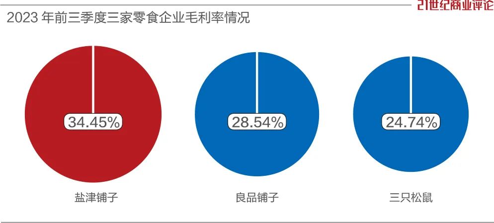 1-9月,盐津铺子的毛利率达34.45%,良品铺子和三只松鼠分别是28.54%和24.74%。