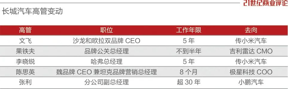 人员流失,长城近期未有外部高管加盟信息,挑大梁的,多为内部成长。