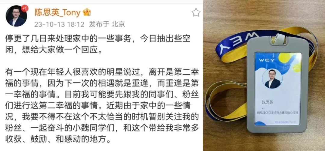 其也没有像其他高管一样,转发公司消息。10月,魏牌旗下“高山”新品发布会上,周文没露面。