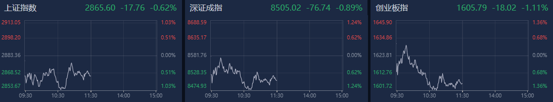 A股三大指数上午延续跌势,创业板指冲高回落跌超1%,续创调整新低。南财金融终端显示,截至上午收盘,上证指数跌0.62%,深证成指跌0.89%,创业板指跌1.11%。沪深两市个股跌多涨少,近4000只个股下跌。