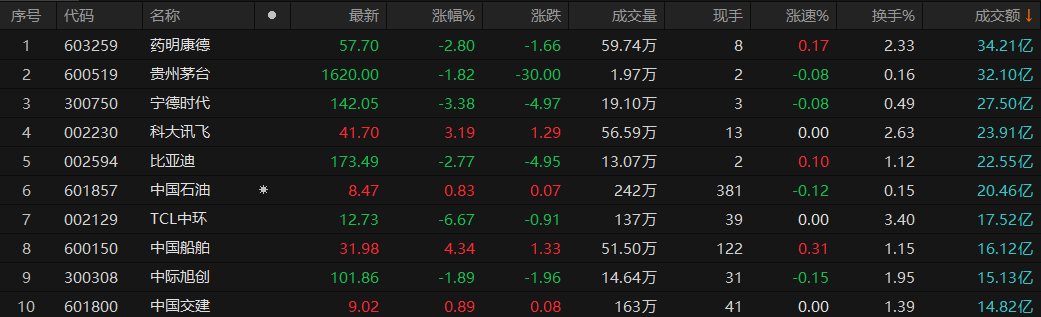 沪深两市半天成交额4015亿元,较上一交易日同期大幅缩量1231亿元。个股方面,截至午间收盘,药明康德成交额排名第一,达34.21亿元;贵州茅台、宁德时代、科大讯飞、比亚迪、中国石油成交额也在20亿元以上,分别为32.10亿元、27.50亿元、23.91亿元、22.55亿元、20.46亿元。