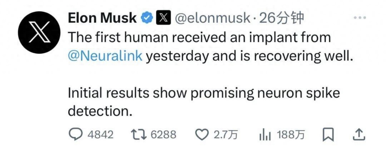 当地时间29日,马斯克在其社交平台上发文称,“昨天,第一位人类患者接受了来自‘神经连接’公司的植入手术,目前恢复良好。初步结果显示,神经元尖峰检测很有前景。”