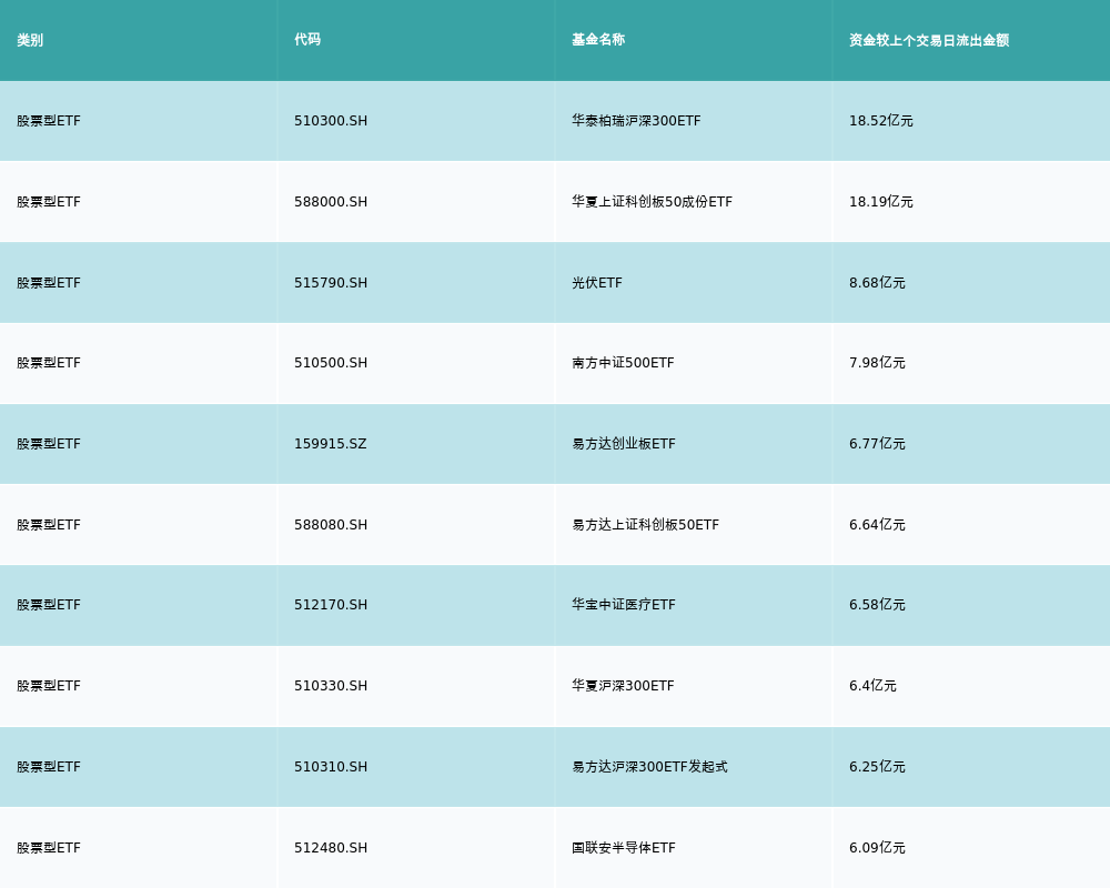 昨日股票型ETF资金流出最多的3支ETF及其流入金额分别为:华泰柏瑞沪深300ETF(流出18.52亿元)、华夏上证科创板50成份ETF(流出18.19亿元)、光伏ETF(流出8.68亿元)。资金流出前10详情见下表: