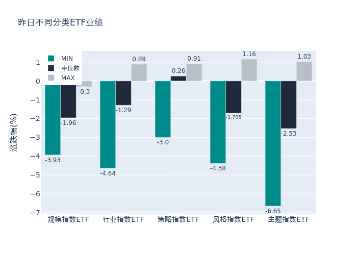 昨日股票型ETF收益率中位数为-1.97%。其中按照不同分类,规模指数中国泰沪深300增强策略ETF收益率最高,为-0.3%;行业指数中富国中证800银行ETF收益率最高,为0.89%;策略指数中南方标普中国A股大盘红利低波50ETF收益率最高,为0.91%;风格指数中招商中证银行AH价格优选ETF收益率最高,为1.16%;主题指数中招商中证沪港深消费龙头ETF收益率最高,为1.03%。