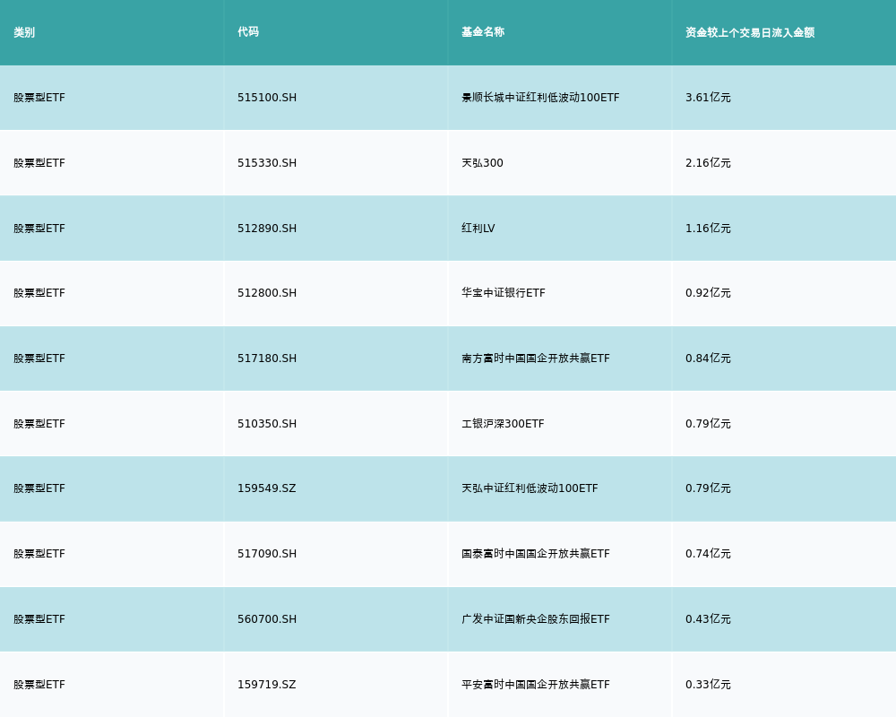 昨日股票型ETF资金流入最多的3支ETF及其流入金额分别为:景顺长城中证红利低波动100ETF(流入3.61亿元)、天弘300(流入2.16亿元)、红利LV(流入1.16亿元)。资金流入前10详情见下表: