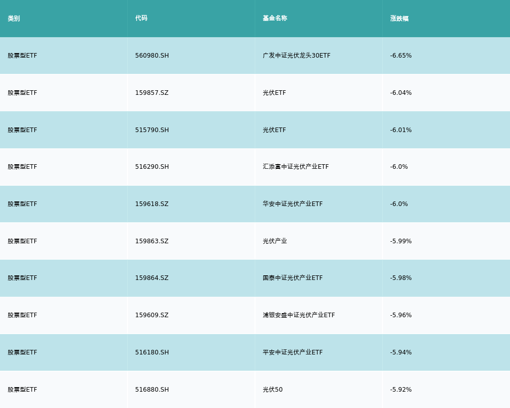 昨日股票型ETF跌幅最大的3支ETF及其收益率分别为:广发中证光伏龙头30ETF(-6.65%)、光伏ETF(-6.04%)、光伏ETF(-6.01%)。跌幅前10详情见下表: