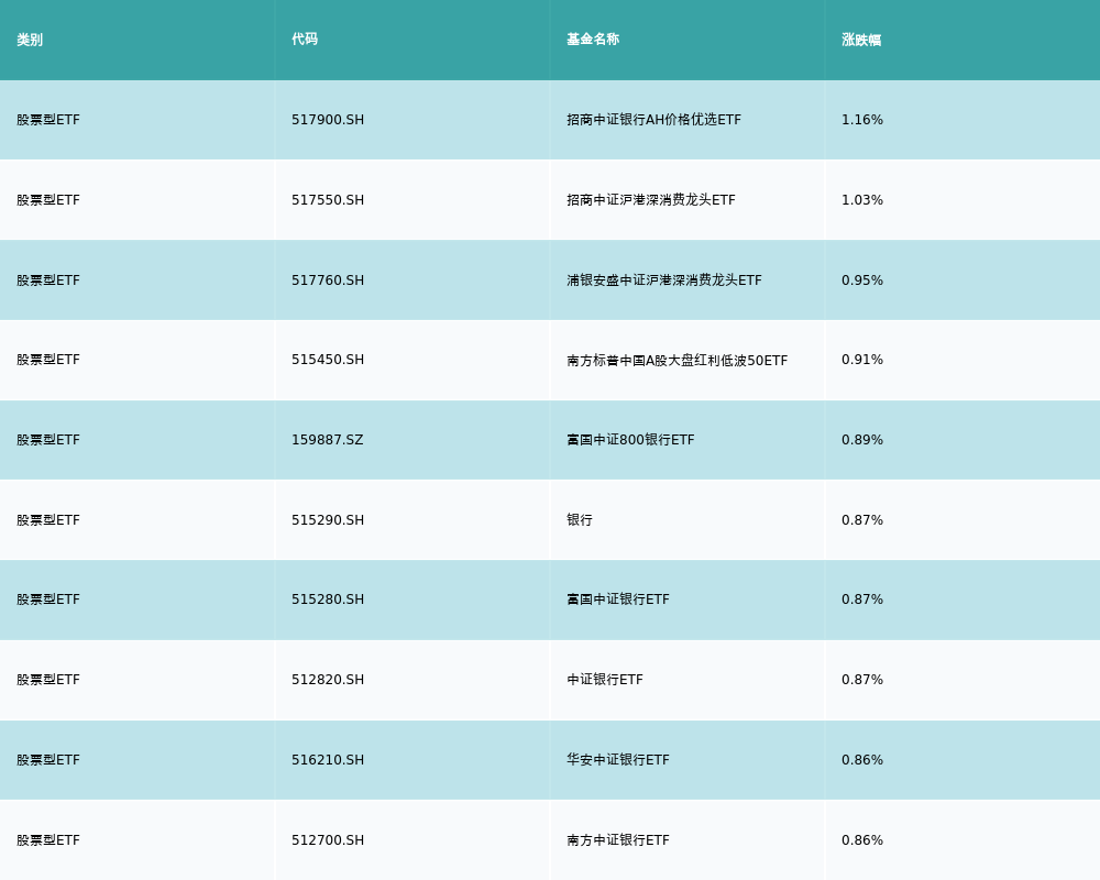 昨日股票型ETF涨幅最高的3支ETF及其收益率分别为:招商中证银行AH价格优选ETF(1.16%)、招商中证沪港深消费龙头ETF(1.03%)、浦银安盛中证沪港深消费龙头ETF(0.95%)。涨幅前10详情见下表: