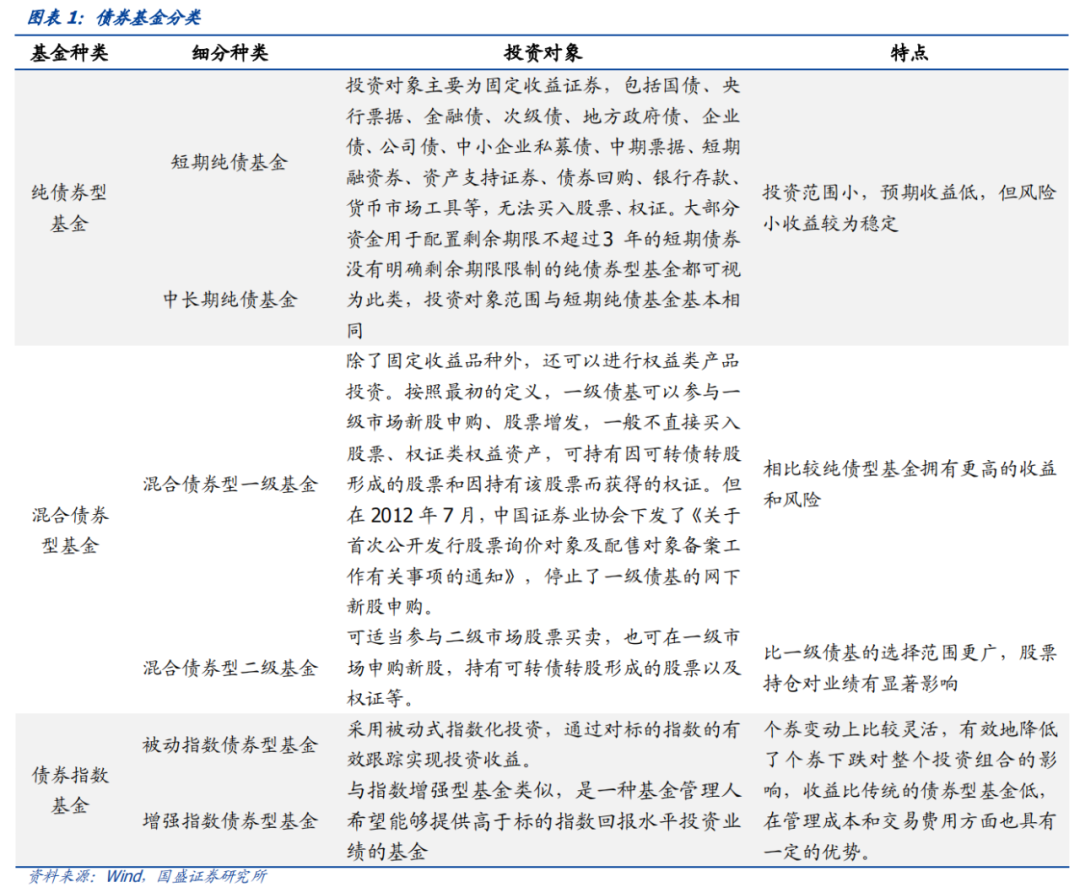 正如上文所提到的,债券型基金也可以分为多个细分种类,不同类型的产品往往呈现出不同的风险收益特征。根据投资范围,债券型基金一般可以分为纯债基金、混合型债基和债券指数基金三种(国盛证券)。