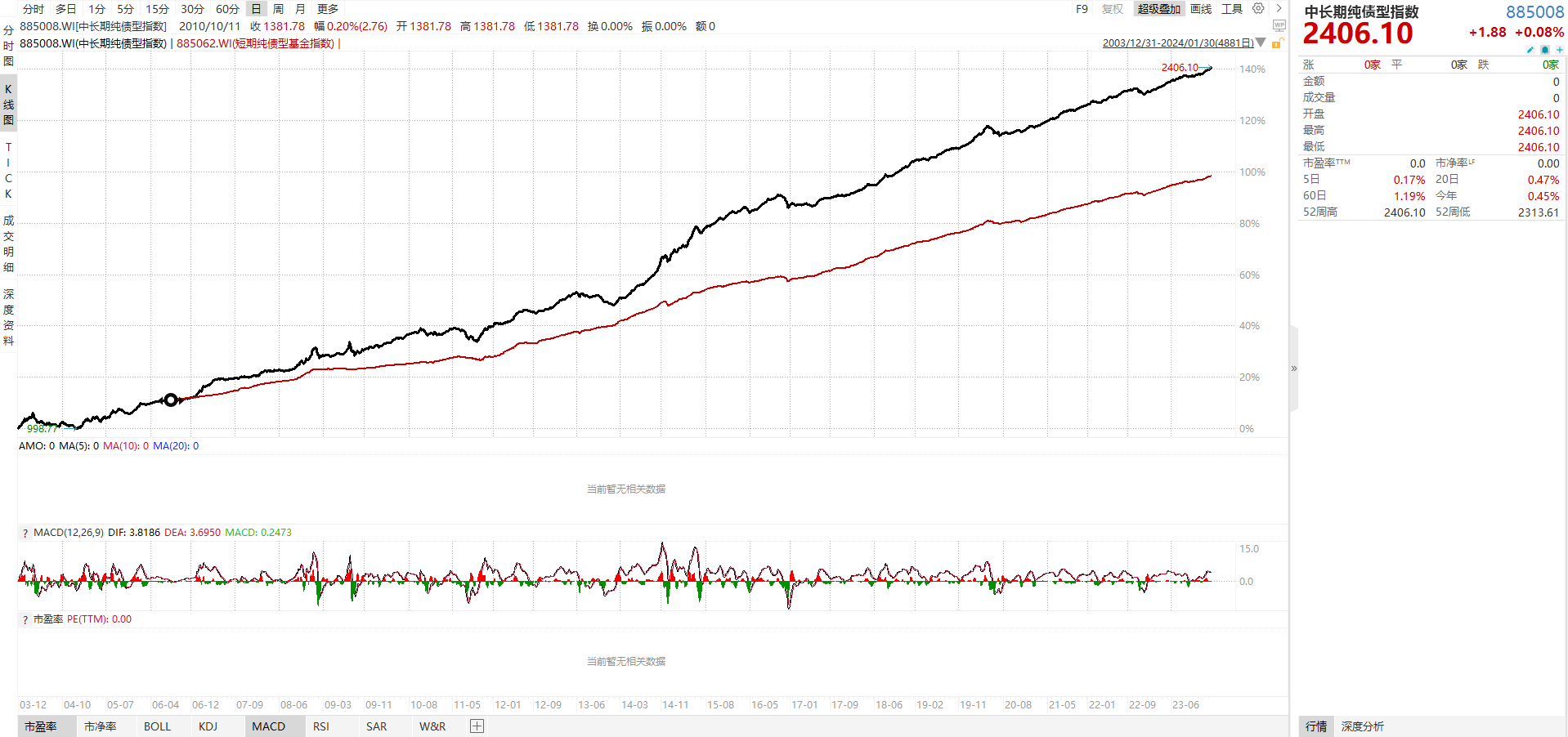 而2024年开年以来,债市继续震荡走强,债基净值也实现增长。截至1月31日收盘,万得短期纯债型基金指数涨至1787.22点,创历史新高;万得中长期纯债型基金指数也持续走强,现报2406.10点,也创历史新高。