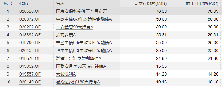 具体来看,国寿安保利率债三年期定开作为一只中长期纯债基金首募规模为78.99亿元,该基金于2024年1月15日起面向全社会公开募集,原定募集截止日为2024年4月14日,后于2024年1月23日提前结募。渤海汇金汇享益利率债A和国联安月享30天持有纯债A也属于中长期纯债基,发行规模分别为21.80亿元和15.95亿元。