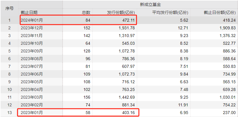Wind数据显示,截至1月31日,以基金成立日作为统计标准(下同),2024年1月份共有84只基金发行,发行总份额为472.11亿份。对比去年同期,今年1月份新基的发行数量和发行规模均实现增长,分别较2023年1月的58只和403.16亿元同比增长44.82%和17.1%。